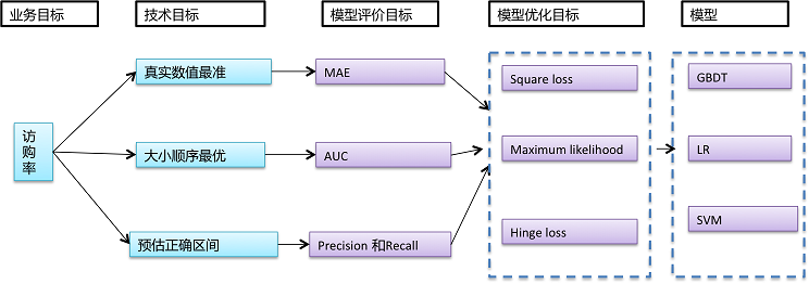 對(duì)于DEAL交易額這個(gè)問題,我們認(rèn)為直接預(yù)估難度很大,希望拆成子問題進(jìn)行預(yù)估,即多模型模式。那樣就需要建立用戶數(shù)模型和訪購率模型,因?yàn)闄C(jī)器學(xué)習(xí)解決問題的方式類似,下文只以訪購率模型為例。要解決訪購率問題,首先要選擇模型,我們有如下的一些考慮: