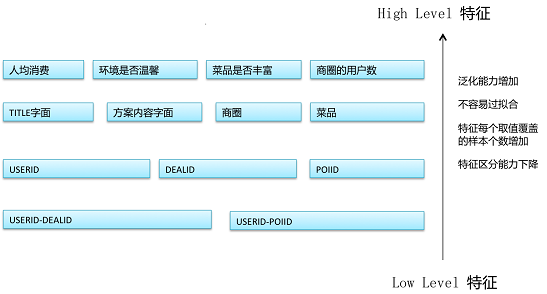 所以,總體上,Low Level 比較有針對(duì)性,單個(gè)特征覆蓋面?。ê羞@個(gè)特征的數(shù)據(jù)不多),特征數(shù)量(維度)很大。High Level比較泛化,單個(gè)特征覆蓋面大(含有這個(gè)特征的數(shù)據(jù)很多),特征數(shù)量(維度)不大。長(zhǎng)尾樣本的預(yù)測(cè)值主要受High Level特征影響。高頻樣本的預(yù)測(cè)值主要受Low Level特征影響。