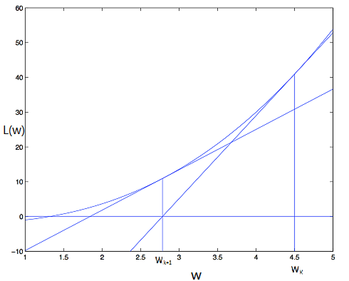 牛頓法的基本思想是在極小點(diǎn)附近通過對(duì)目標(biāo)函數(shù)做二階Taylor展開,進(jìn)而找到L(w)的極小點(diǎn)的估計(jì)值。形象地講,在wk處做切線,該切線與L(w)=0的交點(diǎn)即為下一個(gè)迭代點(diǎn)wk+1(示意圖如下)。w的更新公式如下,其中目標(biāo)函數(shù)的二階偏導(dǎo)數(shù),即為大名鼎鼎的Hessian矩陣。