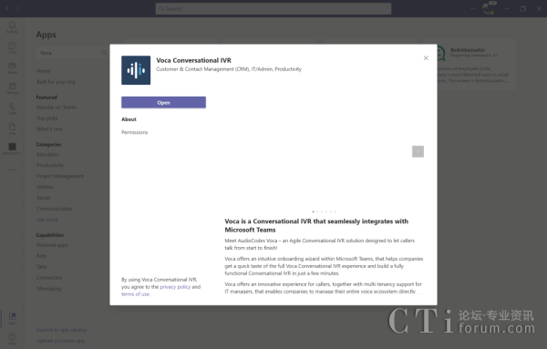 通過進(jìn)一步合作,AudioCodes和Microsoft已讓Voca成為了一款專為對話式IVR應(yīng)用提供的、易于使用的Teams應(yīng)用??蓪?shí)現(xiàn)直接從Teams的APP商店調(diào)用Voca,直接在云端安裝和部署,簡潔簡單,無需事先掌握專業(yè)技能,即可一步步按照導(dǎo)引完成安裝。