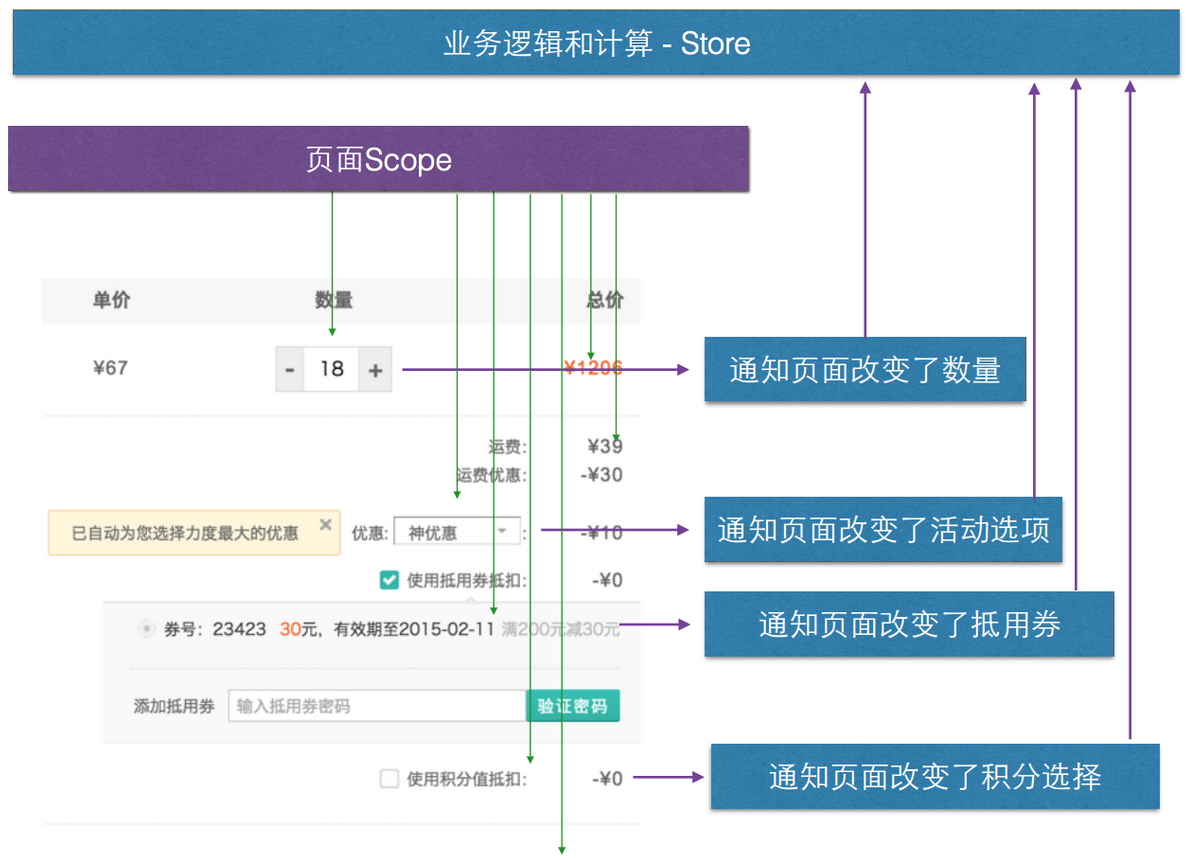 實(shí)現(xiàn)數(shù)據(jù)綁定后,美團(tuán)不得不面對(duì)另外一個(gè)問題:如何協(xié)同多個(gè)組件間的數(shù)據(jù)。因?yàn)槟硞€(gè)組件的數(shù)據(jù)變化,很有可能引起其他組件的變化。例如當(dāng)修改購買數(shù)量,總金額會(huì)變化,而總金額超過 500 后,還需要展示大額消費(fèi)提醒。