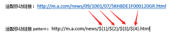 1)規(guī)則適配:當(dāng)pc地址和移動(dòng)地址存在規(guī)則(pattern)的匹配關(guān)系時(shí)(如PC頁(yè)面www.jb51.net/picture/12345.html,移動(dòng)頁(yè)面m.jb51.net/picture/12345.html),可以使用規(guī)則適配,添加pc和移動(dòng)的正則表達(dá)式。強(qiáng)烈建議您使用規(guī)則適配,一次提交成功生效后,對(duì)于新增同規(guī)則的URL可持續(xù)生效,不必再進(jìn)行多次提交。同時(shí)該方式處理周期相對(duì)URL適配更短,且易于維護(hù)和問(wèn)題排查,是百度推薦使用的提交方式。