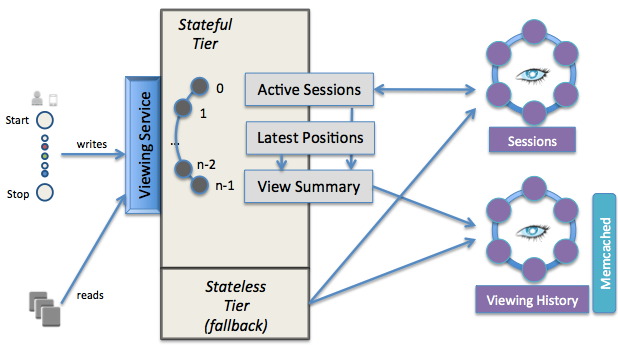 整個(gè)架構(gòu)最主要的接口是觀看會(huì)話服務(wù),它分為有狀態(tài)層和無(wú)狀態(tài)層兩部分。有狀態(tài)層在內(nèi)存中存有所有活動(dòng)視圖的最新數(shù)據(jù)。通過對(duì)用戶帳戶ID進(jìn)行mod N的模運(yùn)算,數(shù)據(jù)被簡(jiǎn)單地劃分為N個(gè)有狀態(tài)的節(jié)點(diǎn)。當(dāng)有狀態(tài)的節(jié)點(diǎn)上線的時(shí)候,系統(tǒng)會(huì)通過一個(gè)位置選擇流程決定哪部分?jǐn)?shù)據(jù)屬于它們。所有的持久化數(shù)據(jù)都存儲(chǔ)在Cassandra中,在Cassandra之上有一個(gè)Memcached用來保證低延遲的讀取路徑,但是采用這種方式會(huì)話數(shù)據(jù)有可能會(huì)過時(shí),同時(shí)如果一個(gè)有狀態(tài)的節(jié)點(diǎn)出現(xiàn)了錯(cuò)誤,那么1/n的瀏覽數(shù)據(jù)將不能讀寫。無(wú)狀態(tài)層的引入正是為了解決這一問題,它提升了系統(tǒng)的可用性,當(dāng)有狀態(tài)的節(jié)點(diǎn)無(wú)法訪問的時(shí)候,該層會(huì)將過時(shí)的數(shù)據(jù)反饋給用戶。