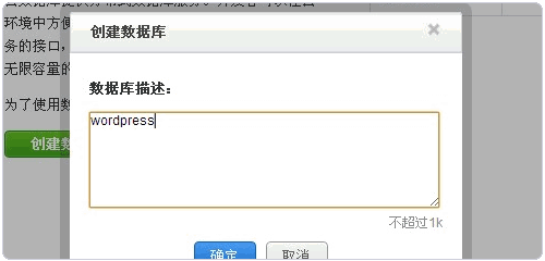 5、點(diǎn)擊“創(chuàng)建數(shù)據(jù)庫(kù)” 輸入數(shù)據(jù)庫(kù)描述,點(diǎn)擊“確定” 。