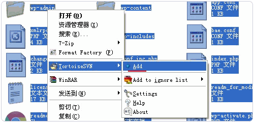 3、全選WP文件,右鍵——“TortoiseSVN”——“Add”(增加)