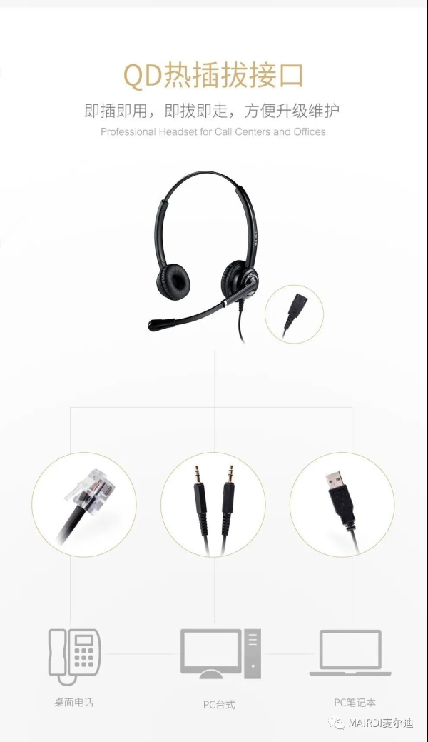 麥爾迪(MAIRDI)MRD-612DNC以升級維護(hù)無憂為前提,專業(yè)設(shè)計QD熱拔插接口,只需一部耳機(jī),連接不同配線,即可實現(xiàn)不同設(shè)備間自由轉(zhuǎn)換,手機(jī)、電腦、電話機(jī),即插即用、即拔即走,升級維護(hù)無憂。