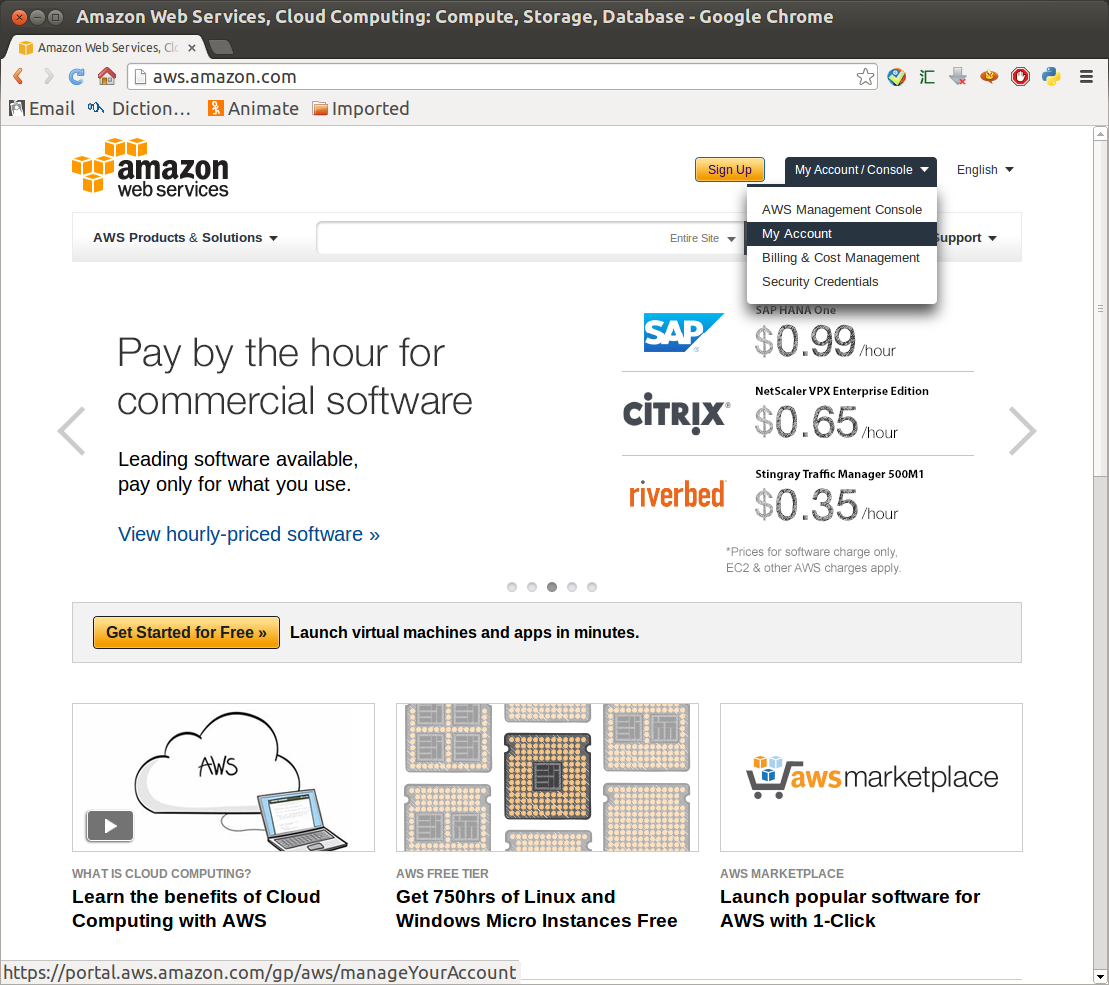 上面的"My Account / Console"菜單中,我的賬戶(hù)(My Account)主要包括各種賬戶(hù)和賬單信息。管理面板(Amazon Management Console)用于設(shè)置AWS的云服務(wù)。