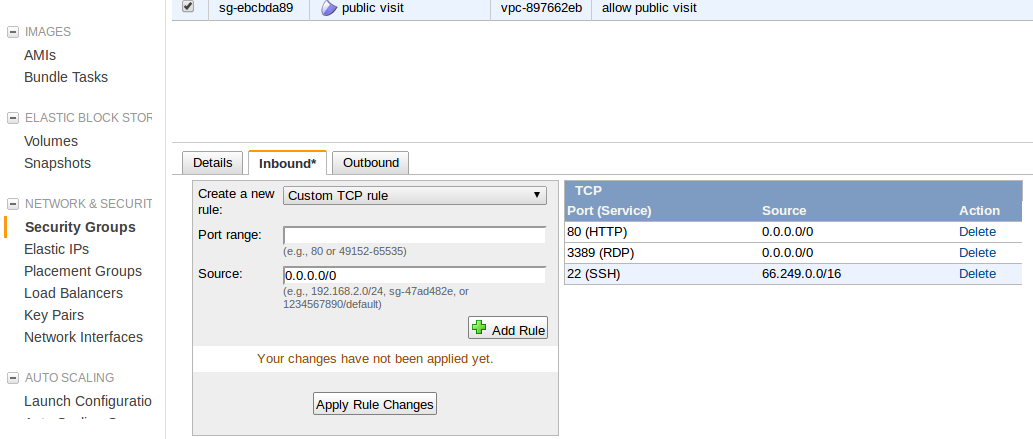 這里主要說(shuō)明Security Groups的訪問(wèn)權(quán)限設(shè)置。我們剛才在創(chuàng)建實(shí)例中,允許所有的IP訪問(wèn)SSH端口。由于我們的目的是架設(shè)一個(gè)WordPress的Web站點(diǎn),我們還需要開(kāi)放80和3389端口。