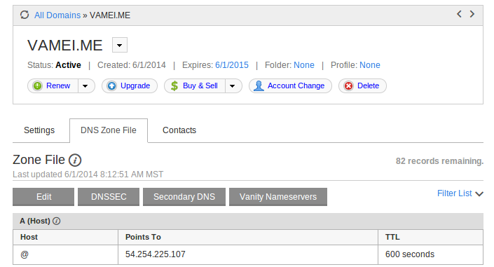 點(diǎn)擊vamei.me一行的Launch按鈕,進(jìn)入vamei.me域名的詳情頁(yè)面。選擇修改DNS Zone File。將一開(kāi)始的A Host的IP地址,改為實(shí)例的IP地址: