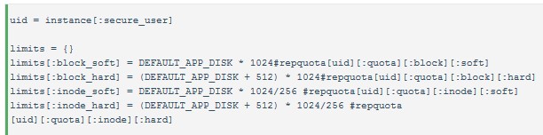 當(dāng)部署一個(gè)應(yīng)用實(shí)例時(shí),quota設(shè)置磁盤(pán)配額。上面vcap safemode提到,每個(gè)實(shí)例都分配一個(gè)用戶,而quota就是對(duì)此用戶的配額管理。Quota管理blocks和inodes有hard和soft兩個(gè)臨界點(diǎn),超過(guò)soft值,可允許繼續(xù)使用,若超過(guò)hard值,就不再允許寫(xiě)入操作了。