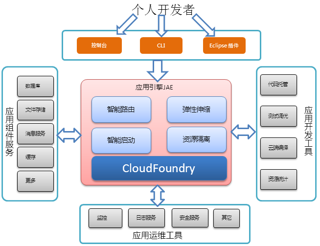 京東PaaS平臺(tái)的核心是JAE(Jingdong App Engine),它以Cloud Foundry為內(nèi)核,之所以選擇Cloud Foundry,是因?yàn)镃loud Foundry是最早開(kāi)源,在社區(qū)里最成熟、最活躍的基礎(chǔ)PaaS平臺(tái)。為了給開(kāi)發(fā)者提供更加便捷的服務(wù),JAE將基礎(chǔ)服務(wù)云化,接入各種應(yīng)用組件服務(wù),諸如高可用MySQL服務(wù)、Redis緩存集群服務(wù)、以及消息隊(duì)列等;此外,它結(jié)合應(yīng)用開(kāi)發(fā)工具,為開(kāi)發(fā)者提供了類github的代碼托管服務(wù),云測(cè)試和Java工程云端編譯,以及資源統(tǒng)計(jì)信息,讓開(kāi)發(fā)者可以更專注于自己的代碼業(yè)務(wù)。再者,JAE對(duì)托管在平臺(tái)上的應(yīng)用進(jìn)行健康監(jiān)控,支持查看應(yīng)用日志,提供其它安全服務(wù)。讓開(kāi)發(fā)者只需關(guān)心自己應(yīng)用代碼,而其它一切事情,都由JAE為其提供,極大地提高了開(kāi)發(fā)者的效率,降低了開(kāi)發(fā)成本。下圖描述了JAE與PaaS平臺(tái)用戶及其他相關(guān)服務(wù)之間的關(guān)系。