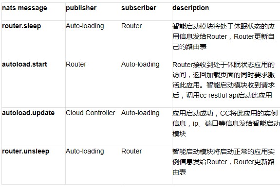 如圖所示,智能啟動(dòng)也用到了訪問(wèn)日志的計(jì)算結(jié)果,計(jì)算的是每個(gè)應(yīng)用在統(tǒng)計(jì)周期內(nèi)的訪問(wèn)次數(shù),同樣保存在Redis集群中。智能啟動(dòng)模塊從CCDB中過(guò)濾取得待處理的應(yīng)用列表,依次獲取Redis關(guān)于周期內(nèi)應(yīng)用的總訪問(wèn)次數(shù),如發(fā)現(xiàn)為零則先調(diào)用cc restful api 停止應(yīng)用,再將CCDB中的此應(yīng)用標(biāo)識(shí)為sleep狀態(tài),同時(shí)通知Router更新路由表信息,這樣路由表中既有所有正在運(yùn)行的應(yīng)用實(shí)例信息,又有sleep狀態(tài)的應(yīng)用信息。當(dāng)Router接收到下一個(gè)訪問(wèn)的時(shí)候,首先從路由表是查找對(duì)應(yīng)的實(shí)例信息,發(fā)現(xiàn)此應(yīng)用處于sleep狀態(tài),就會(huì)激活此應(yīng)用,并且立刻返回給客戶端一個(gè)正在加載頁(yè)面。這樣再刷新頁(yè)面,就可以正常訪問(wèn)應(yīng)用了。下表從nats message來(lái)說(shuō)明模塊間的交互: