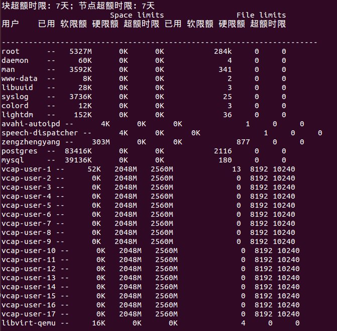 Block和inode都給了512M的緩沖值。因?yàn)閷?shí)例停止或刪除后,用戶會(huì)回收,所以此用戶的quota需要重置。Repquota -auvs 查看磁盤(pán)使用情況: