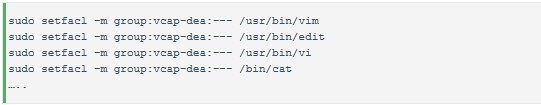 vcap safemode只是設(shè)置了應(yīng)用目錄的權(quán)限,限制了目錄間的訪問(wèn),但是仍然可以看到或操作大部分系統(tǒng)命令,系統(tǒng)文件,如ls, mkdir, /usr/bin,/etc/init.d/,這是很危險(xiǎn)的。JAE通過(guò)linux的ACL(access control list)將大部分的系統(tǒng)命令都禁掉了,這有點(diǎn)殺敵一千自損八百的味道,很多應(yīng)用是需要調(diào)用系統(tǒng)命令的。ACL的具體做法是限制了用戶組vcap-dea對(duì)絕大多數(shù)系統(tǒng)命令的查看、操作權(quán)限: