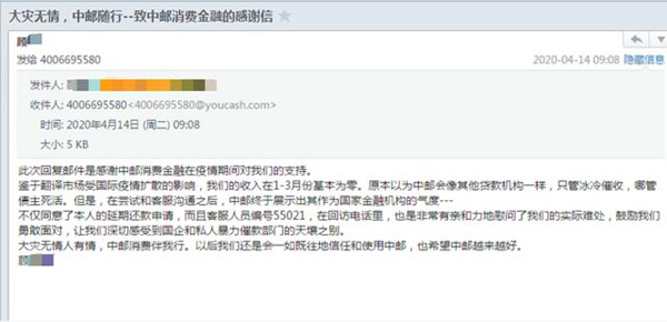 因為責(zé)任所在,也因為對客戶訴求足夠重視,中郵消費金融客服近期在收到公安吳先生的感謝信后,再次收到一封顧先生的感謝信—《大災(zāi)無情,中郵隨行--致中郵消費金融的感謝信》,表示疫情期間中郵消費金融公司勇于擔(dān)當(dāng),協(xié)助客戶挺過困難時刻。