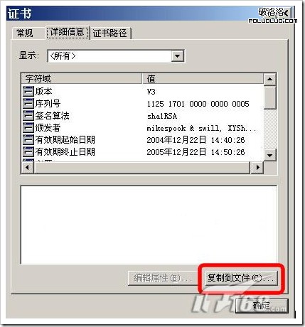 第四步:在“頒發(fā)的證書”下找到剛才那個證書,雙擊打開。并在“證書屬性窗口”的詳細信息標(biāo)簽中選擇“復(fù)制到文件”。