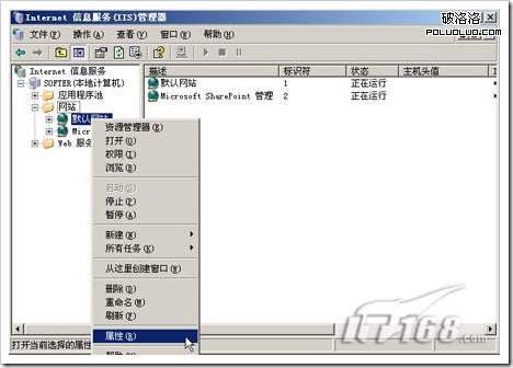第二步:在默認網(wǎng)站上點鼠標(biāo)右鍵選擇“屬性”。