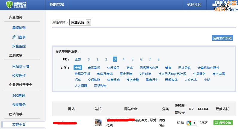 從去年開始百度、Google就開始打擊鏈接交易平臺(tái)了,而360網(wǎng)站安全檢測(cè)反其道而行之,在今年4月中旬推出了友鏈交換平臺(tái),對(duì)各種網(wǎng)站進(jìn)行了分門別類,非常全面,而其參考標(biāo)準(zhǔn)則是360搜索收錄、PR值和Alexa排名。