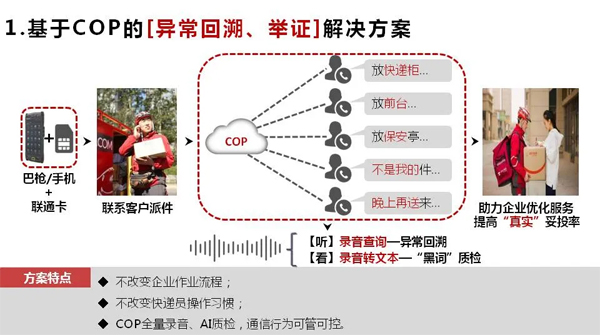 早在18年,小京就在COP基礎(chǔ)上搭建了集約多省的倉(cāng)儲(chǔ)管理系統(tǒng)。得到好評(píng)后,2020年一季度,小京又與運(yùn)營(yíng)商自有平臺(tái)(COP)合作了集約管理快遞小哥的實(shí)體卡錄音項(xiàng)目,一步完成對(duì)快遞投件過(guò)程中的通話行為的全面監(jiān)督和有效回溯。