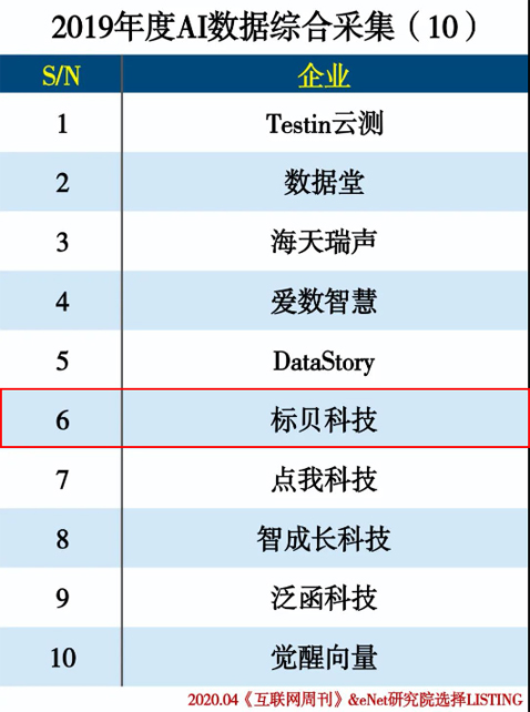 4月16日,中國科學院主管、科學出版社主辦的核心雜志《互聯(lián)網周刊》聯(lián)合eNet研究院共同發(fā)布了《2019年度大數(shù)據(jù)產業(yè)分薦》榜單。標貝科技憑借專業(yè)、高精度的AI數(shù)據(jù)采標服務,入選“2019年度AI數(shù)據(jù)綜合采集TOP10”。同時,這也是標貝科技不久前入選以上機構發(fā)布的“2020數(shù)據(jù)標注公司排行”榜單后,獲得的又一行業(yè)殊榮。