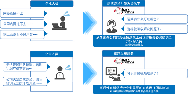 transcosmos集團(tuán)(以下簡稱transcosmos;總部:日本東京;總裁兼COO:奧田昌孝)自3月24日起,為實(shí)行居家辦公的企業(yè)客戶提供IT服務(wù)臺技術(shù)支持和視頻培訓(xùn)部署服務(wù)。