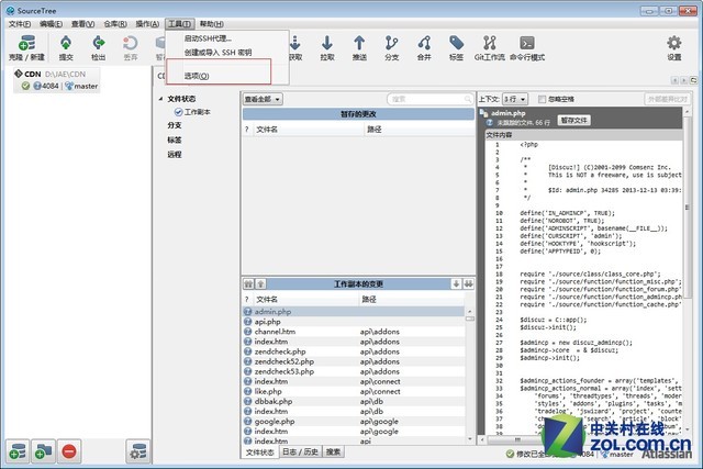 點擊選項按鈕之后,就會看到上面這個對話框了,所有對勾的部分跟筆者保持一致即可。SSH密鑰部分請點擊右側(cè)的按鈕,找到你剛剛保存到本地的密鑰文件添加即可,這些事情都做好之后,請點擊右下角被ZOL水印擋住地方的“確定”按鈕,到這一步,本地代碼庫、以及本地SSH密鑰與服務器SSH密鑰的連接就已經(jīng)完全做好了。