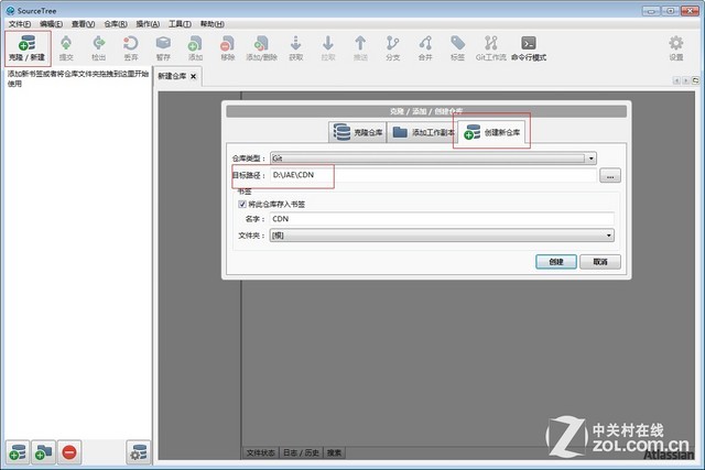 之前讓大家打開SourceTree,沒有手賤關了吧?讓我們回到SourceTree,首先點擊左上角紅框標識的“克隆/新建”按鈕,之后會彈出右側(cè)對話框,在右側(cè)對話框上點擊“創(chuàng)建新倉庫”按鈕。之后你可以在你的硬盤里建立一個倉庫目錄,比如筆者就建立在D盤JAE文件夾里的CDN文件夾里。選擇相應路徑之后點擊創(chuàng)建按鈕即可。