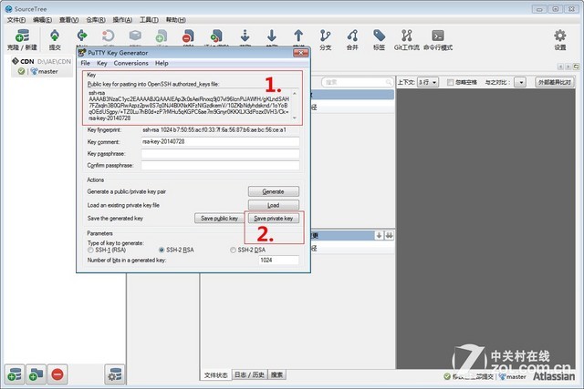 等進度條讀完之后,就會看到下圖所示的對話框了。這時你首先要把數(shù)字1標識出的SSD密鑰內(nèi)容Copy下來,最好放在TXT里以免悲劇。之后再點擊數(shù)字2標識出的Save Private Key按鈕來保存你的密鑰,Key文件名自己設定即可,保存的位置一定要記住,不要保存之后忘了保存在哪哦。