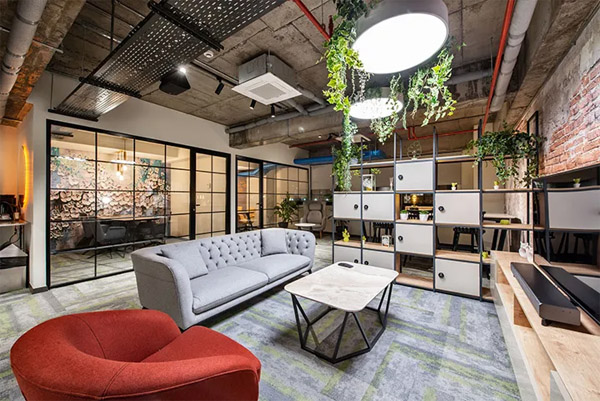 設(shè)計利用建筑本身所呈現(xiàn)的工業(yè)風(fēng)特色,采用暗調(diào)配色方案去強(qiáng)化這一空間特質(zhì)。裸露的頂面管道設(shè)施卻噴涂以靚麗的色彩,與各空間元素形成色彩上的呼應(yīng);加以溫暖的木飾面、以及大量的綠植點(diǎn)綴,在暗調(diào)中塑造了一個充滿活力色彩的時尚辦公空間。