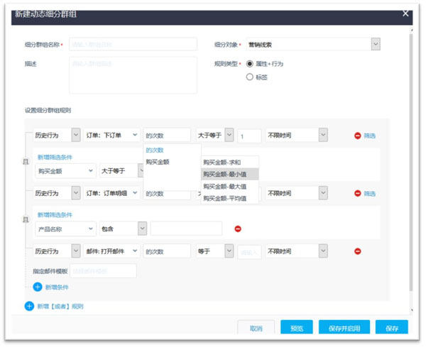 企業(yè)可以根據(jù)客戶屬性和行為或者客戶標簽,創(chuàng)建更為精細化的細分群組。例如可以將客戶觸發(fā)行為設(shè)置為“客戶近半年購買過一次及一次以上產(chǎn)品”,同時設(shè)置產(chǎn)品類型和價格,通過更加詳細的細分群組規(guī)則,實現(xiàn)精準人群定向投放。