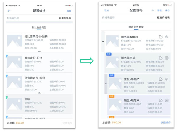 隨著新版CPQ移動端推出,將訂單編輯頁面以組合產(chǎn)品形式進行層級展示,既有利于客戶對組合產(chǎn)品進行快速編輯,更利于直觀地查看各個組合產(chǎn)品的報價、折扣等信息,幫助企業(yè)實現(xiàn)組合產(chǎn)品的動態(tài)配置,以及滿足多種促銷場景的復(fù)雜定價,如特價、折扣、贈品等,從而提升銷售人員報價效率,縮短從報價到成單的周期。