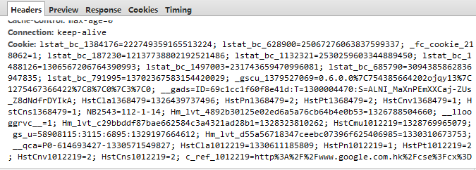 由于修改這兩個(gè)設(shè)置需要重啟IIS(net stop http, net start http, iisreset),并且只是表面上解決問題,所以我們沒有立即采取這個(gè)方法。又回過頭來在Chrome中查看請(qǐng)求頭,突然發(fā)現(xiàn)cookie的值好長(zhǎng)。