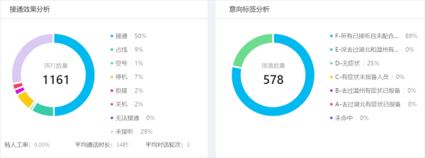 小E可根據(jù)群眾的反饋,分析意向進(jìn)行標(biāo)簽化統(tǒng)計(jì),快速的、及時(shí)的完成調(diào)查跟蹤工作。在徐州沛縣公安局,小E完成了外呼任務(wù)后自動(dòng)完成接電統(tǒng)計(jì)、旅行/返鄉(xiāng)統(tǒng)計(jì)、接觸情況統(tǒng)計(jì)、癥狀統(tǒng)計(jì)、未調(diào)查人員統(tǒng)計(jì)等工作。