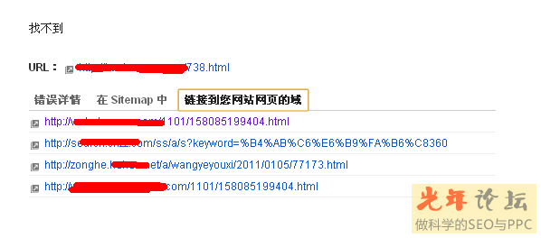 點擊第102條,彈出下面的框,url不在sitemap中,但是在自己的其他網(wǎng)站里面出現(xiàn),說明網(wǎng)址是網(wǎng)站自身存在的但是已經(jīng)被刪除了