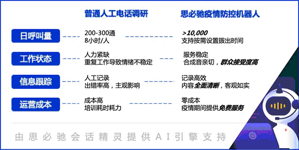 針對這一困境,思必馳推出“疫情防控機器人”,在疫情期間向全國相關(guān)政府部門、醫(yī)療機構(gòu)、公益機構(gòu)提供免費人工智能服務(wù),可替代社區(qū)人力,向海量轄區(qū)居民主動撥打電話,調(diào)研近期行蹤、摸排人員往來,加強重點人員健康監(jiān)測和跟蹤保障。
