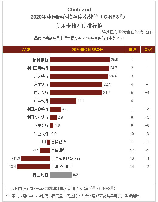 服務(wù)革新直接提升用戶體驗,在2020年1月發(fā)布的2020年(第六屆)中國顧客推薦度指數(shù)(C-NPS)品牌排名和分析報告上,招行信用卡再次榮膺第一。