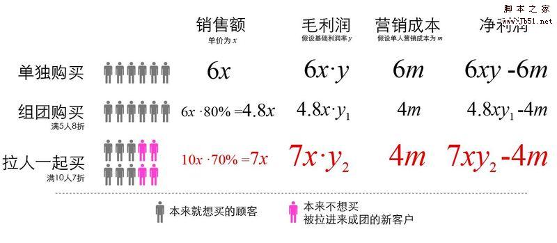 商家角度說,我們來算一筆賬,就知道商家為什么從團(tuán)購中獲利,也為什么有無數(shù)商家因?yàn)閳F(tuán)購在虧錢。下圖,零售價(jià)為x元的商品,利潤率為y,單人營銷成本是m,商家的促銷政策是5個(gè)人一團(tuán)8折,10個(gè)人7折。那么