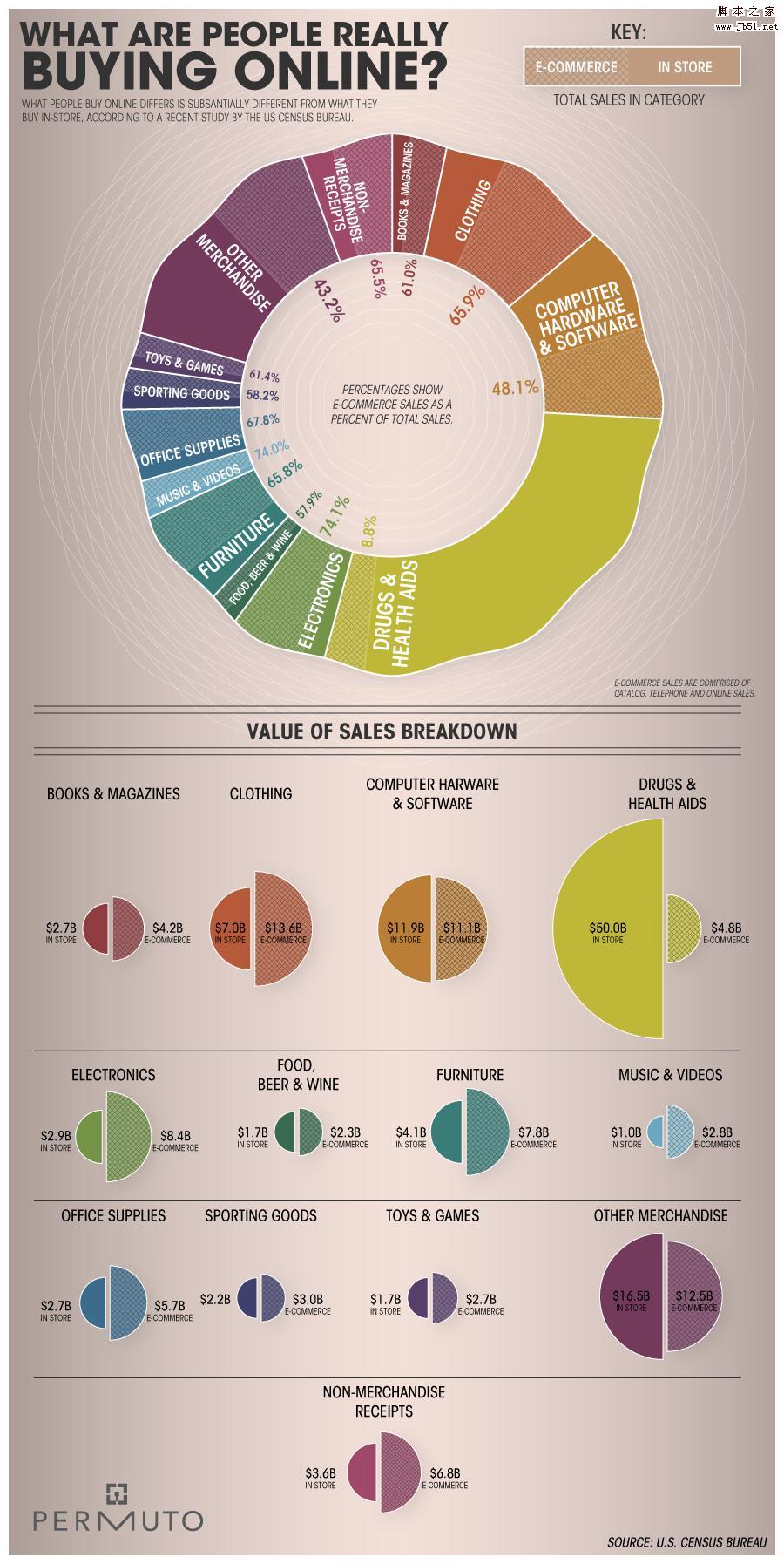 美國(guó)統(tǒng)計(jì)局的一項(xiàng)研究數(shù)據(jù)顯示,在商品銷售總額方面,由線下占據(jù)多數(shù);不僅如此,在每個(gè)單獨(dú)的品類上,也大都是線下購(gòu)買多于線上購(gòu)買。然而在有幾個(gè)商品品類,線上購(gòu)買占據(jù)了主導(dǎo)位置。這些品類包括:書籍和雜志,服飾,電子產(chǎn)品。