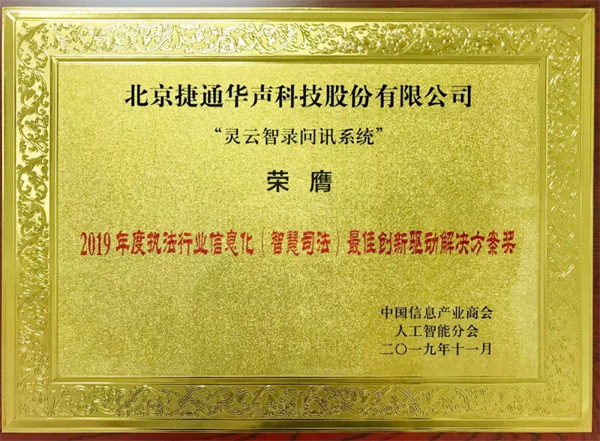 捷通華聲打造的靈云智錄問訊系統(tǒng),憑借全方位人工智能技術(shù)的強融合能力、問訊場景的高適配性,榮獲“2019年度執(zhí)法行業(yè)信息化(智慧司法)最佳創(chuàng)新驅(qū)動解決方案獎”。