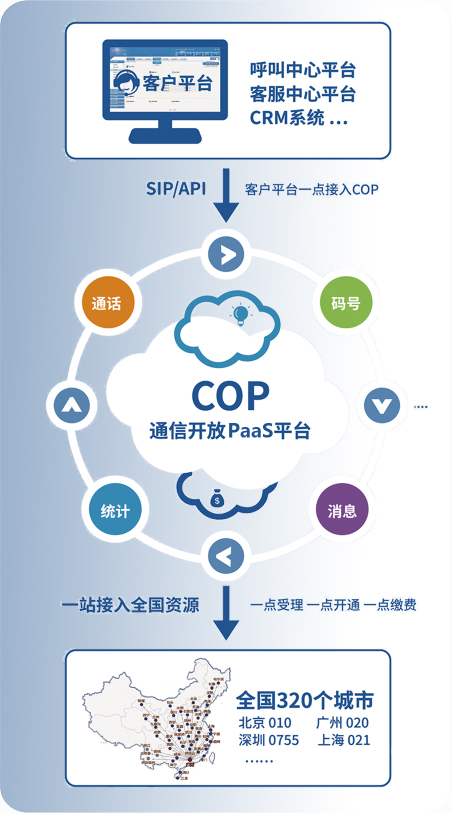 COP(Communication Open Platform通信開放平臺)是中國聯(lián)通在通信供給側改革的重大創(chuàng)新,將運營商的語音、碼號等網(wǎng)絡能力云化開放,封裝成可通過接口調(diào)用的API代碼形態(tài),可被無縫集成到客戶的應用系統(tǒng)中,幫助企業(yè)客戶降本、增效、促轉型,是目前業(yè)內(nèi)唯一擁有全國號碼、支持全網(wǎng)錄音的通信開放平臺。