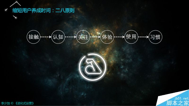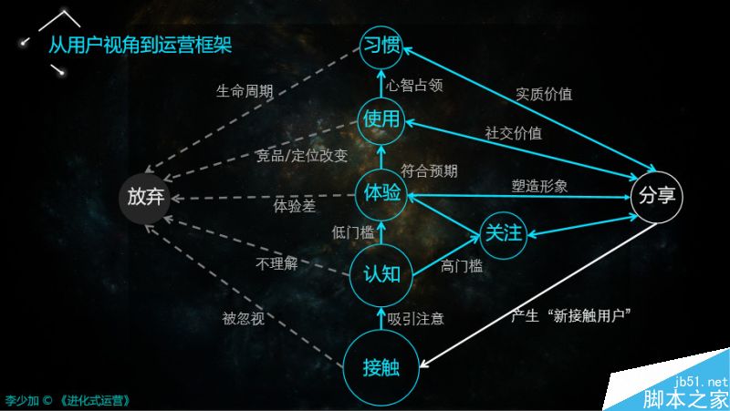 首先運(yùn)營不是簡單一下就把潛在用戶變成一個(gè)習(xí)慣用戶的過程。恰恰相反,運(yùn)營是循序漸進(jìn)、環(huán)環(huán)相扣而使?jié)撛谟脩艮D(zhuǎn)化成習(xí)慣用戶的一個(gè)漫長過程,而且這個(gè)過程當(dāng)中,這些用戶還會(huì)不斷的影響他生活軌跡中的其他用戶。這一系列的認(rèn)知非常重要,從用戶視角來看,所有人從接觸、認(rèn)知、關(guān)注、體驗(yàn)、習(xí)慣,所有的過程都是一致的、統(tǒng)一的、穩(wěn)定的。