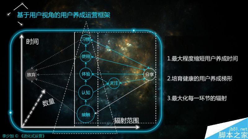 以時(shí)間作為縱向坐標(biāo)軸,以輻射的范圍作為橫向坐標(biāo)軸,以數(shù)量作為水平坐標(biāo)軸,套上一個(gè)框架。這個(gè)框架就是用戶養(yǎng)成運(yùn)營框架,由此可以推出運(yùn)營工作的實(shí)質(zhì),也是做任何運(yùn)營的一個(gè)策略動(dòng)機(jī)和出發(fā)點(diǎn)。