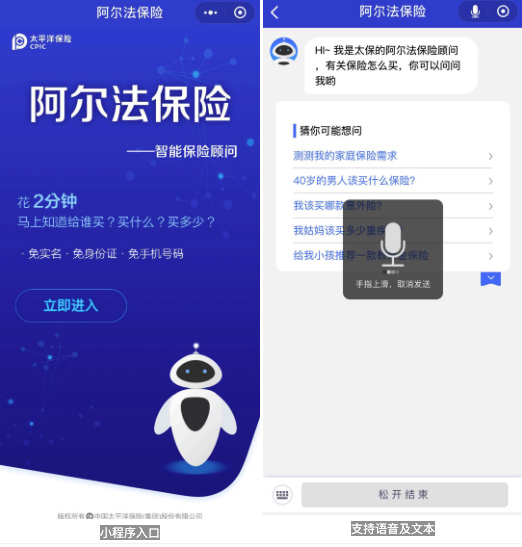歷時(shí)4個(gè)月,太平洋保險(xiǎn)公司攜手竹間智能一同打造的基于自然語言理解技術(shù)和智能推薦算法的智能保險(xiǎn)顧問--阿爾法智能保顧正式亮相。阿爾法智能保顧是全方位的專業(yè)保險(xiǎn)顧問機(jī)器人,通過它,用戶可以使用文本或語音的形式,隨時(shí)隨地咨詢保險(xiǎn)相關(guān)知識,了解如何購買保險(xiǎn),應(yīng)該買多少保額的保險(xiǎn),以及保險(xiǎn)產(chǎn)品推薦等專業(yè)保險(xiǎn)知識。