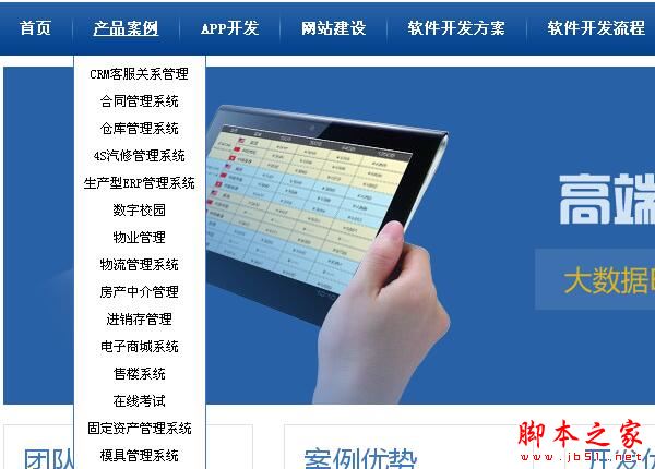 網(wǎng)站的導(dǎo)航欄目加上首頁(yè)一共有9個(gè)一級(jí)欄目。分別是:首頁(yè)、產(chǎn)品案例、APP開(kāi)發(fā)、網(wǎng)站建設(shè)、軟件開(kāi)發(fā)方案、軟件開(kāi)發(fā)流程、開(kāi)發(fā)工具、軟件外包、公司簡(jiǎn)介以及聯(lián)系我們。一共分為兩次截圖,如下圖: