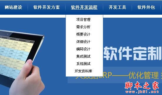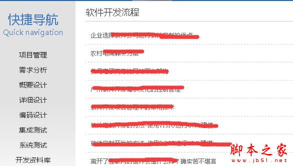 下面在看看“軟件開(kāi)發(fā)流程”這個(gè)欄目下面的二級(jí)導(dǎo)航設(shè)計(jì),從首頁(yè)到“軟件開(kāi)發(fā)”下面的內(nèi)容頁(yè)面,只需要三次點(diǎn)擊,而且還是扁平設(shè)計(jì),層級(jí)分明合理獨(dú)立,很完美。如下圖所示: