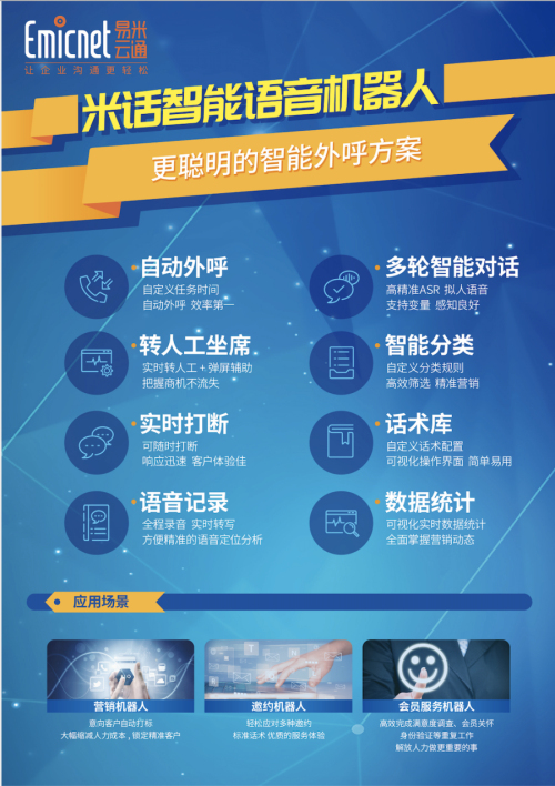 作為專業(yè)智能語音平臺服務(wù)商,易米云通新近研發(fā)的米話·智能語音機(jī)器人早已為銀行業(yè)通信技術(shù)迭代升級,讓催繳還款更加便捷高效,提供了全方位的解決方案。在人力資源緊張,擴(kuò)招新人困難的今天,利用智能語音機(jī)器人處理重復(fù)性工作,助力人工提升工作效率,已經(jīng)成為銀行業(yè)的不二之選。