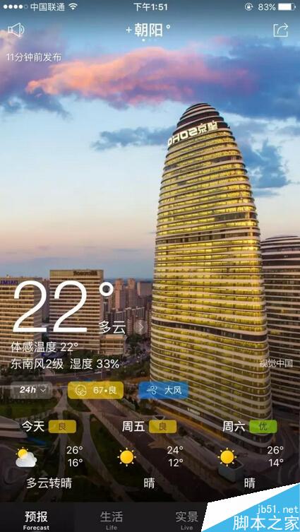 天氣通的背景圖片都很美,而且可以根據(jù)用戶所在的地理位置,展現(xiàn)附近的標(biāo)志性建筑。比如,我就經(jīng)常能刷到望京SOHO。