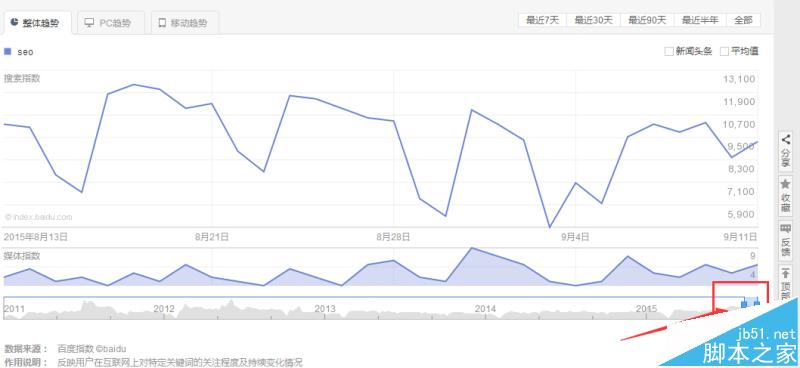 熱點趨勢:這個曲線圖顯示的是seo這個關鍵詞的每天的搜索數量。再結合上圖(紅色方框),就可以知道一些關鍵詞是刷出來的還是真實的搜索數據,操作方法是往左拉動圖片標注紅色那個東西,可以看見近幾年的歷史數據,如果上面的曲線圖有高有低就表示不是刷的,如果前面是平線,突然有了搜索量就表示是刷出來的指數。