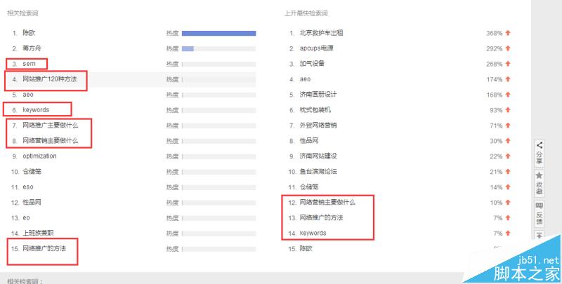 熱門搜索:左下方的是與查詢的關鍵字相關的相關檢索詞,如圖所示,右邊的是上升最快檢索詞,也就是說這些詞最近和seo相關度很大的詞,也是用戶需求的,可以作為長尾詞來更新文章,會給網站帶來很多流量。