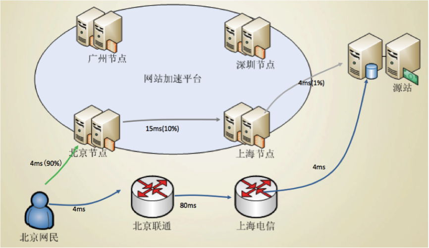 CDN最大的特色在于加速。那么,CDN是如何實(shí)現(xiàn)各種“加速”,發(fā)揮“加速”功用呢?如下圖所示,CDN有很多節(jié)點(diǎn),通過域名實(shí)現(xiàn)就近接入。當(dāng)用戶發(fā)起一個(gè)請(qǐng)求后,CDN會(huì)回源取,然后把文件就近緩存在那個(gè)節(jié)點(diǎn)的服務(wù)器上。假設(shè)北京的用戶到北京節(jié)點(diǎn)只需4毫秒,后面寫了一個(gè)90%的請(qǐng)求其實(shí)都直接命中到了服務(wù)器,那么還有10%的流量回到了二級(jí)cache節(jié)點(diǎn)。而二級(jí)cache節(jié)點(diǎn)也是同樣的緩存服務(wù)器,假設(shè)它的命中率也是90%,那么最終只有1%的流量到源站。如果純粹回到源站可能需88毫秒,而通過訪問CDN就會(huì)大大縮短時(shí)間,甚至4毫秒就可以讓用戶拿到一個(gè)文件。這是CDN實(shí)現(xiàn)加速的基本原理。
